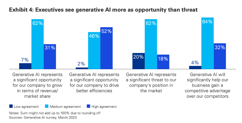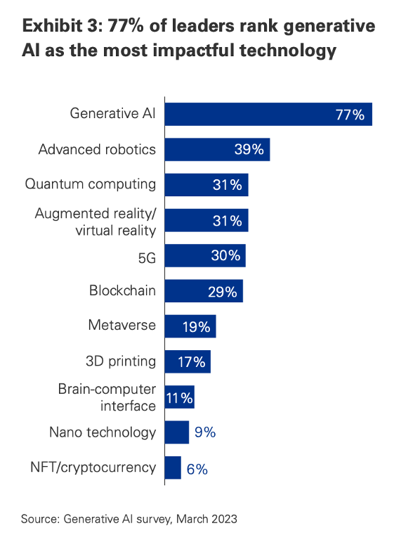 - A significant majority of executives (77%) believe generative AI will substantially impact businesses.