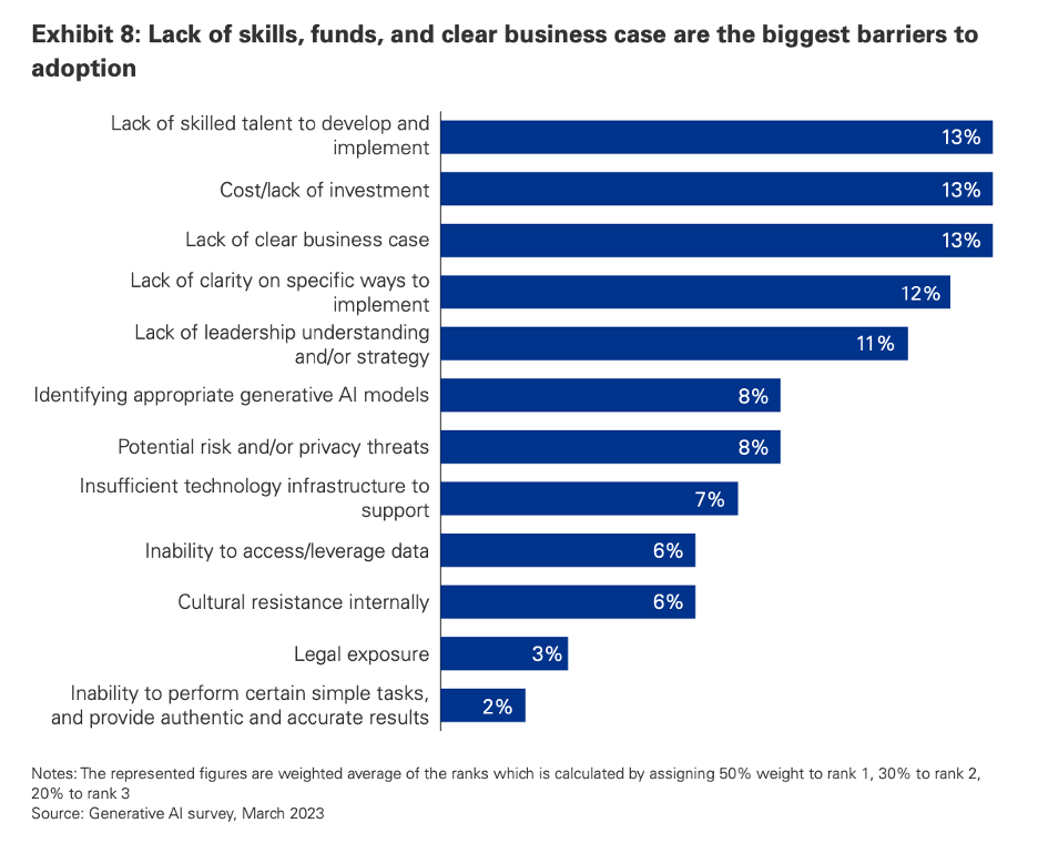 - Questioning Adoption Speed: The report suggests rapid adoption, but this might overlook the complexities and risks involved in integrating generative AI. Organizations could face unforeseen operational and ethical challenges, suggesting a more cautious, step-by-step approach might be prudent.