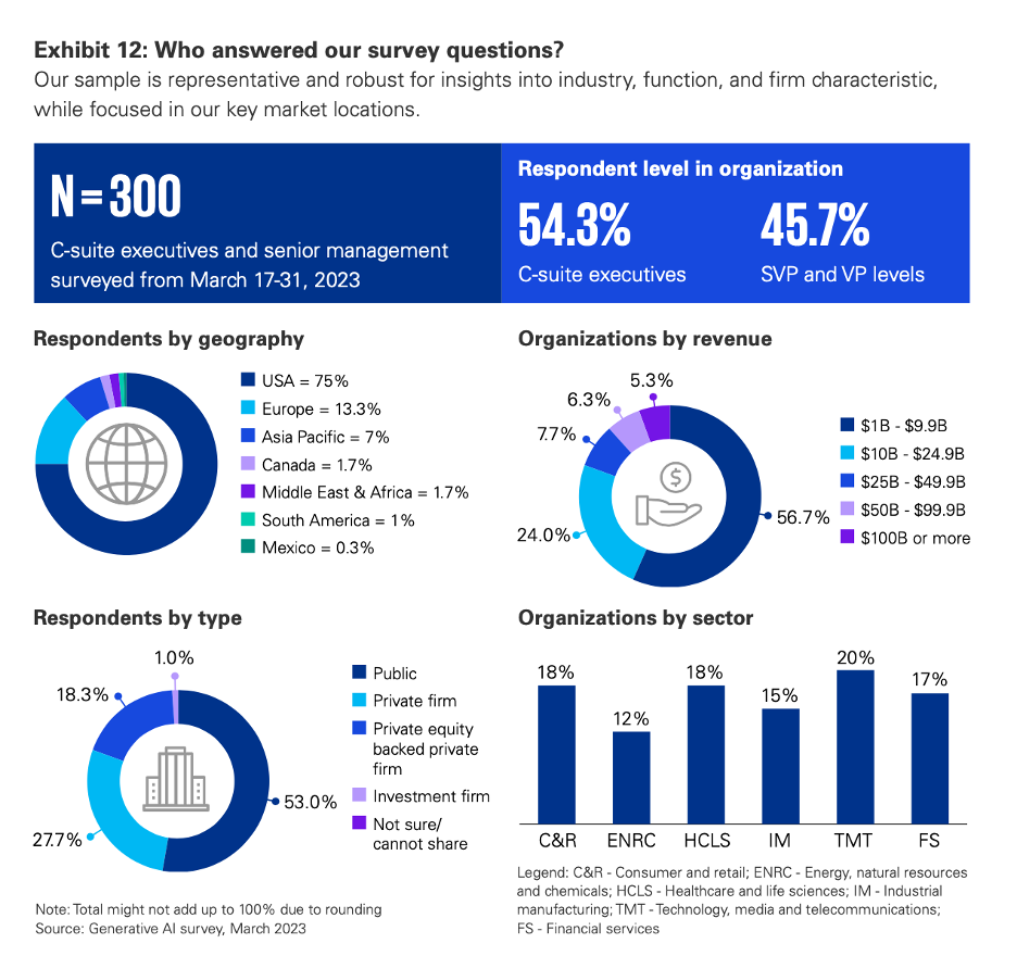 - KPMG conducted an online survey from March 17-31, 2023, with 300 global business executives to explore their views and trends on generative AI.